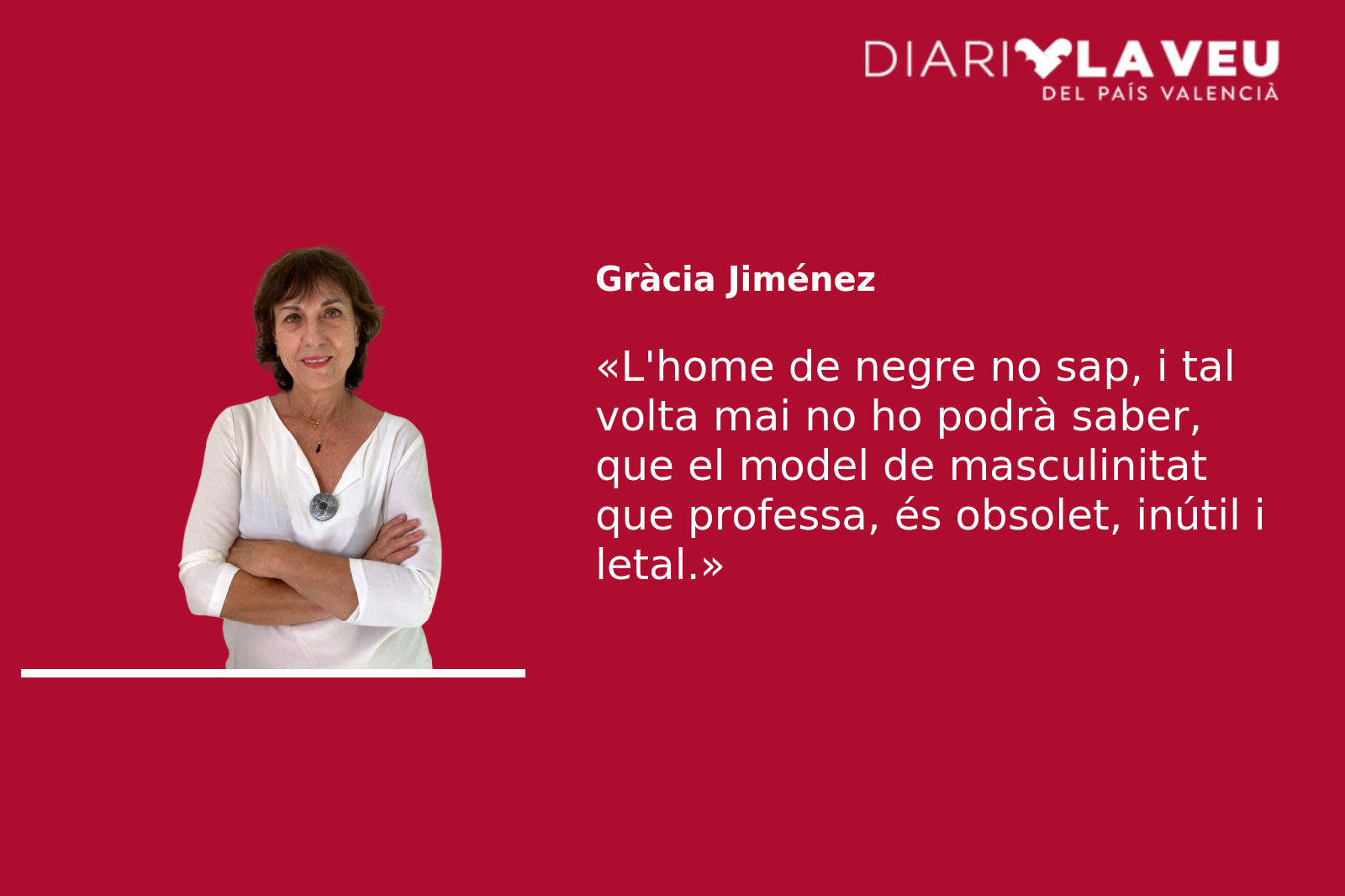 L’home de cara agra i vestimenta negra -potser Isabel Díaz Ayuso pensava en aquest i semblants quan demanava davant els seus correligionaris europeus, estupefactes, una diada per als homes?-, ha begut o mamat el privilegi que vol sostindre. Però ni ell, ni la presidenta madrilenya -val a dir, tota l’extrema dreta-, esgrimint el gran nombre de suïcides masculins, encara no són conscients que qui mata és el masclisme, la insuportable càrrega d’haver de ser un home dominant, protector, proveïdor, dirigent… La frustració per no donar la talla en tot moment aboca molts homes a depressions o conductes de risc, com les addiccions o la conducció temerària, o a l’odi irracional, una altra forma de malaltia. L’home de negre no sap, i tal volta mai no ho puga saber, que el model de masculinitat que professa, és obsolet, inútil i letal, i que tot allò que vol el feminisme és que totes i tots, també ell, visquem lliures i iguals i, dintre de les possibilitats de cadascú, raonablement feliços. Per sort ens tenen a les feministes i tots els seus aliats, cada dia més, intentant acabar amb tanta desgràcia, introduint els estris de la solidaritat i la igualtat de drets. I no ens cansarem.
