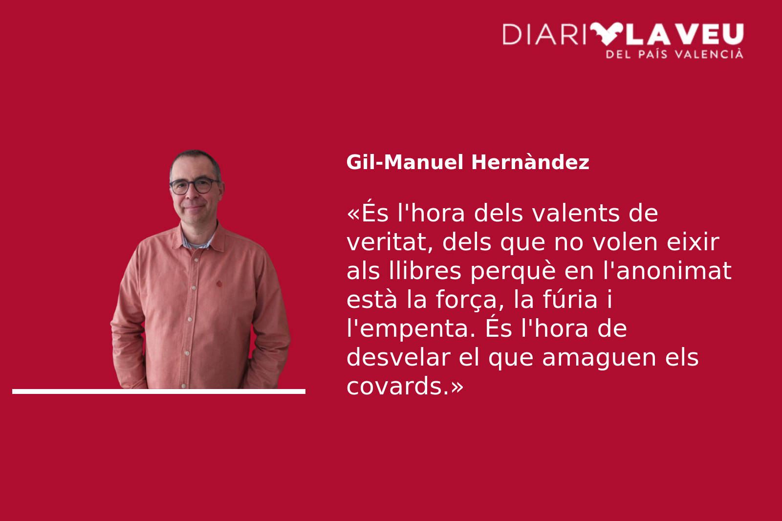 És l’hora de respondre, de refer-se, de protegir-se, d’agermanar-se, de contestar valentament, de no ocultar-se, de no deixar passar més el temps, de no enganyar-se a si mateixos. És l’hora que passen coses. És l’hora dels valents, dels valents de veritat, dels que no volen eixir als llibres d’història perquè en l’anonimat està la força, la fúria i l’empenta. És l’hora de desvelar el que amaguen els covards.
