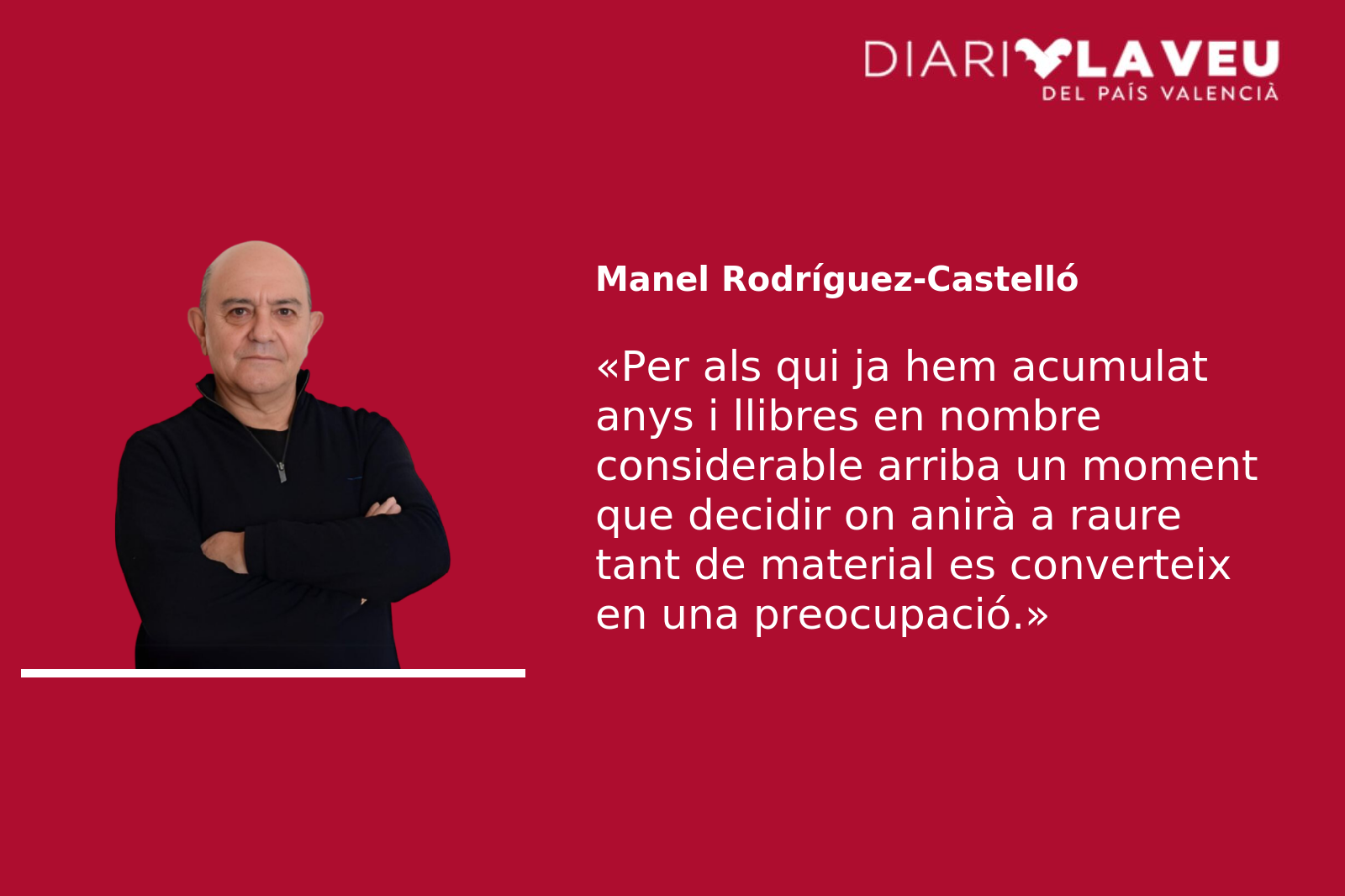 Però per als qui ja hem acumulat anys i llibres en nombre considerable arriba un moment que decidir on anirà a raure tant de material es converteix en una preocupació. Com sabem, el saber sí ocupa lloc. Sobretot, com en el meu cas, quan a la biblioteca pròpia s’hi suma l’heretada, constituïda per uns quants milers de volums que hem hagut de traginar d’ací cap allà, amb alguna estació intermèdia, des de la casa familiar d’Alcoi a la de la Marina. I revisar-los un a un, desempolsegar-los, organitzar-los, marcar-los amb un exlibris amb el famós quadre de Picasso Mà amb ram de flors de 1958 i la llegenda «Biblioteca Dr. Manuel Rodríguez Martínez (Madrid, 1920-Alcoi, 1983), metge neuropsiquiatre i escriptor» que n’identifica la procedència i ajorna l’oblit inevitable, triar-ne per regalar a amics, coneguts i saludats que saps que ho agraeixen. Per altra banda, ja fa temps que vam deixar d’enorgullir-nos pel cúmul de llibres perquè eren la millor demostració d’haver viscut (amb els higiènics oblits que ho fan possible). No és només la manca d’espai material on mantenir-los sinó sobretot la negativa a condemnar-los a un silenci que s’omplirà de pols, a un horitzó de vulgar pasta de paper o de foguera quixotesca. Tenen dret a conquistar noves vides, ens diem, de repetir-se com un eco, de buscar la carícia d’altres mans i l’atenció de nous ulls. I llavors comença una recerca de qui se’n farà càrrec, qui voldrà donar-los una nova oportunitat, qui entendrà el valor del que atresoren, qui menysprearà per fals el tòpic universal que afirma que tot és a internet. Descartats els llibreters de vell, que no els volen ni regalats, les biblioteques públiques que no es dignen ni contestar els teus correus, els museus de la medicina, les universitats i d’altres benemèrites institucions culturals, arribes a la penosa conclusió que ningú no vol llibres. La majoria de campanyes de promoció de la lectura, els llibres i la literatura, fires, congressos, presentacions i tota la parafernàlia, et semblen simples operacions comercials que s’acaben en elles mateixes, de curta volada. La gent, la societat, no s’estima els llibres, que continuen sent objectes de luxe d’estrictes minories. Ahir mateix, quan ja havien donat per extingit l’incendi que va cremar a Ràfol d’Almúnia i Benimeli, el poble d’Isa Tròlec on ens trobàvem per dinar, i quan ja havia aparcat el cotxe, una senyora major em va abordar per preguntar-me si jo entenia de comandaments de televisió. En dir-li que no, que ni idea, i preguntar-me ella què faria sense televisió, no se’m va acudir altra que dir-li: «Doncs agafe un llibre i llija». Em va mirar com si estigués boig, va fer mitja volta amb un gest de menyspreu, i se’n va anar sense dir res.