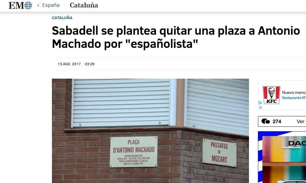 L’agost del 2017 El Mundo publicava que «Sabadell es planteja llevar-li una plaça a Antonio Machado per ‘espanyolista’». La notícia no era certa, ni s’havia plantejat la possibilitat ni s’havia debatut a l’ajuntament. El titular es basava en un informe encarregat pel consistori a un historiador local perquè analitzara el nomenclàtor de la ciutat. Les seues conclusions eren que la representació simbòlica d’aquest era hispanocèntrica, que hi havia una descompensació de figures culturals castellanes davant les catalanes i que això tenia origen en la cosmovisió franquista que havia posat la majoria d’aquests noms. La traducció que en va fer El País? Doncs que «Quevedo i Goya eren franquistes».