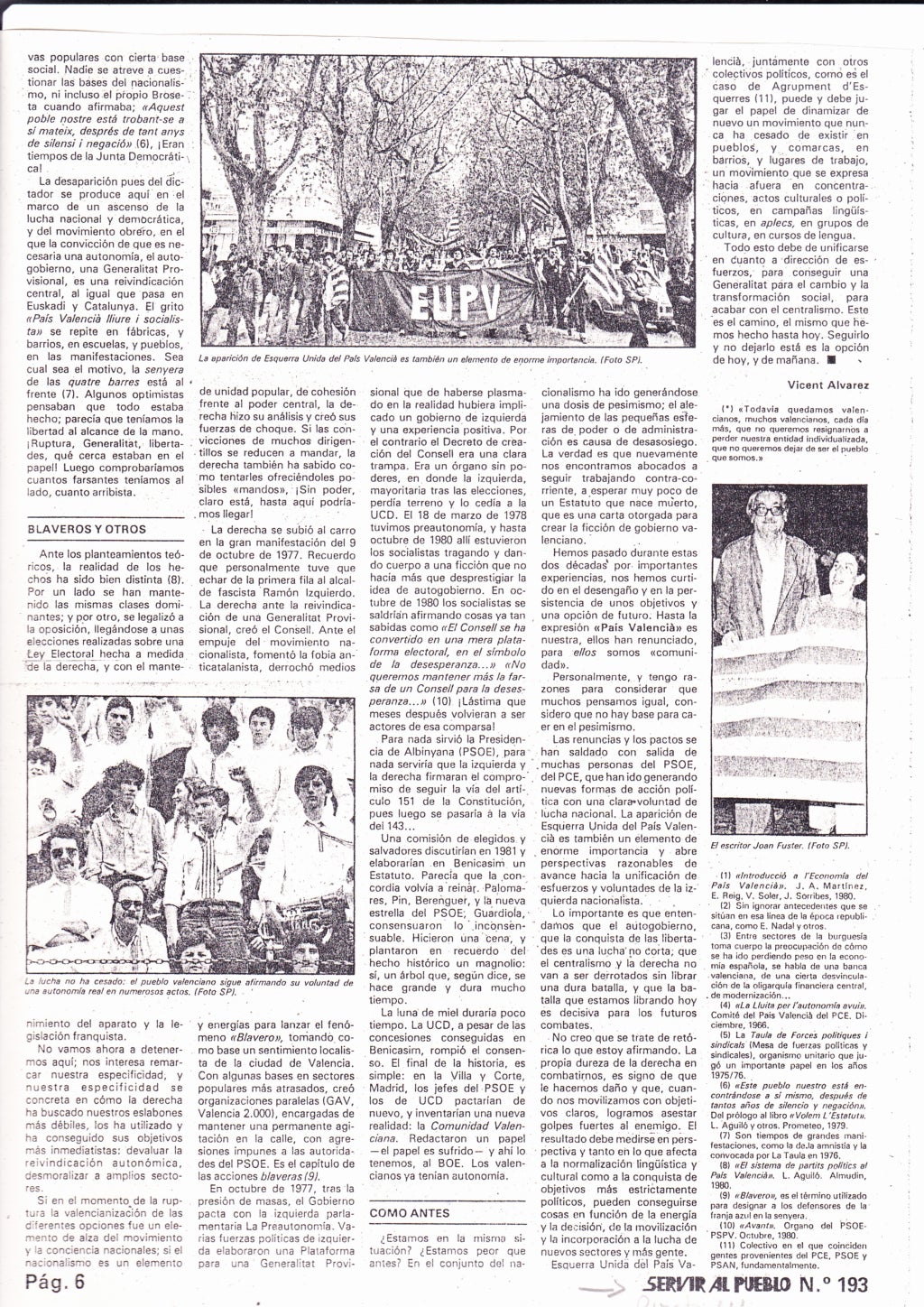Eren altres moments. Així i tot, com veureu, encetada la democràcia va haver-hi un curt espai de temps durant el qual manteníem objectius molt ambiciosos. Fetes les primeres eleccions generals, amb la Constitució, vingueren les primeres municipals, en concret, per la primavera del 1979 algunes candidatures nascudes dels residus de l’esquerra aconseguiren representació als nostres ajuntaments, com fou el cas de Castelló de la Plana, amb dos regidors, i de l’Olleria, on va haver-hi un alcalde del MCPV-OEC (resultat de la fusió del Moviment Comunista i l’Organització d’Esquerra Comunista).