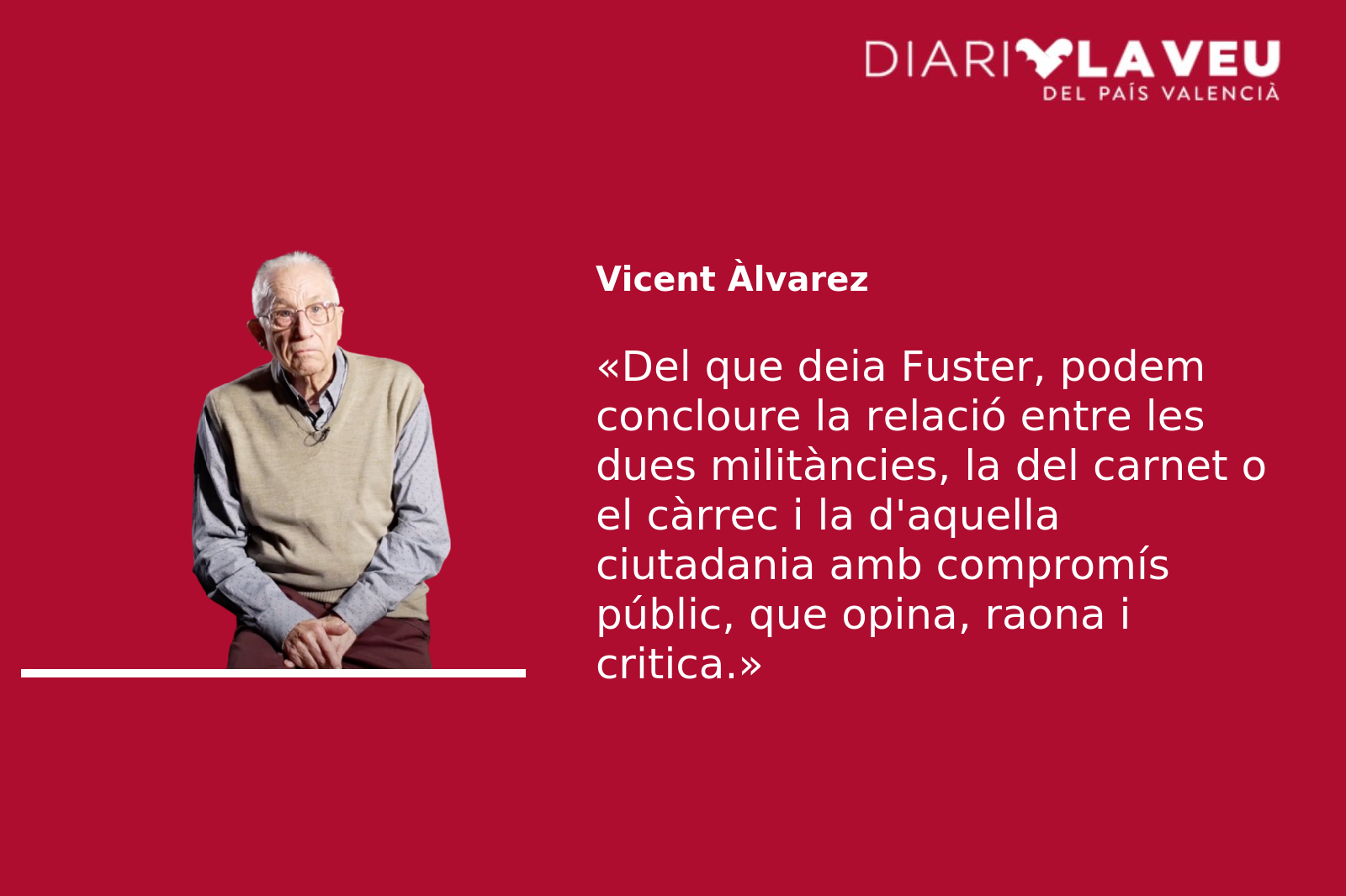 D’allò que deia Fuster, podem també concloure la relació entre les dues militàncies, la del carnet o el càrrec i la d’aquella ciutadania amb compromís explícit i públic que opina, raona, i a voltes critica. Una relació sense vincle, però que pot ser útil, malgrat que puga pecar d’excessivament exigent. Cert, que van havent-hi practiques més obertes, com són les primàries i les consultes a les bases, Així i tot, la militància de les idees, per la simple raó de no tindre vincle, gaudeix de gran llibertat per aportar i expressar consideracions a tindre en compte, vàlides parcialment.