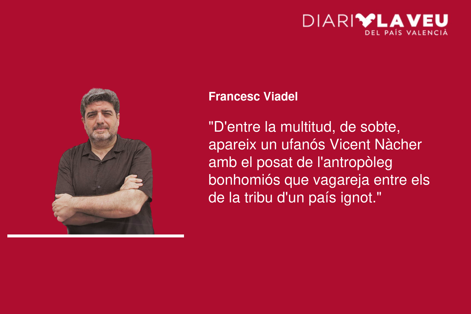D’entre la multitud, de sobte, apareix un ufanós Vicent Nàcher amb el posat de l’antropòleg bonhomiós que vagareja entre els de la tribu d’un país ignot. Sé que aquest era l’indret idoni i també el dia per a trobar-se’l, per a trobar-nos, retrobar-nos. Potser és un dels pocs amics a qui puc contar-li les veritats sense dir-li-les del tot com el malalt i el metge que s’entenen només amb un gest, amb una sola i enigmàtica mirada.