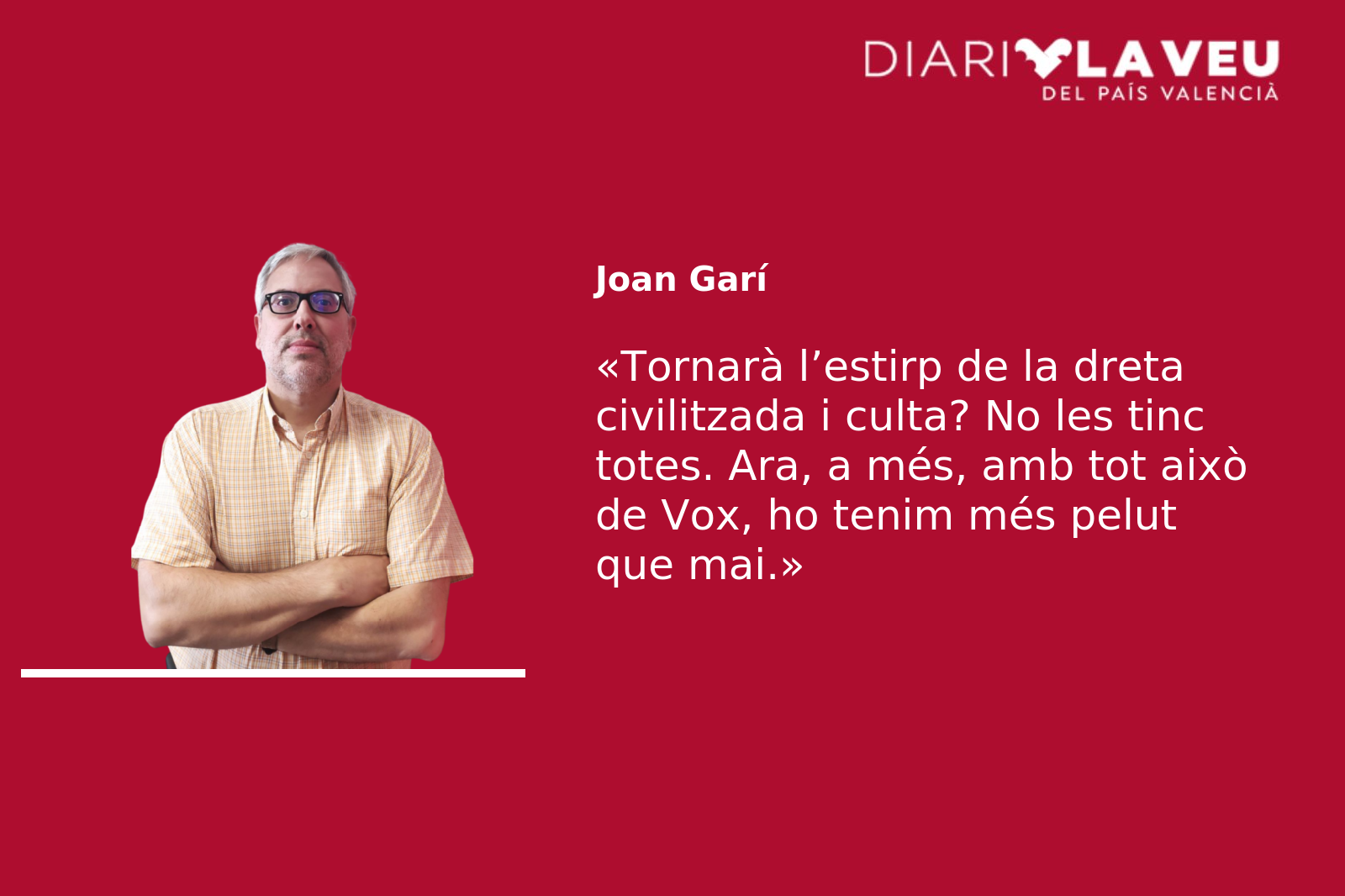 Tornarà l’estirp de la dreta civilitzada i culta? No les tinc totes. Ara, a més, amb tot això de Vox, ho tenim més pelut que mai. Però no podem perdre’n l’esperança, perquè si la perdem seria com acceptar que un valencià de dretes –i n’hi ha centenars de milers…- és algú irreversiblement perdut per al sentit comú, la cultura i la raó. I això és fa difícil de digerir.