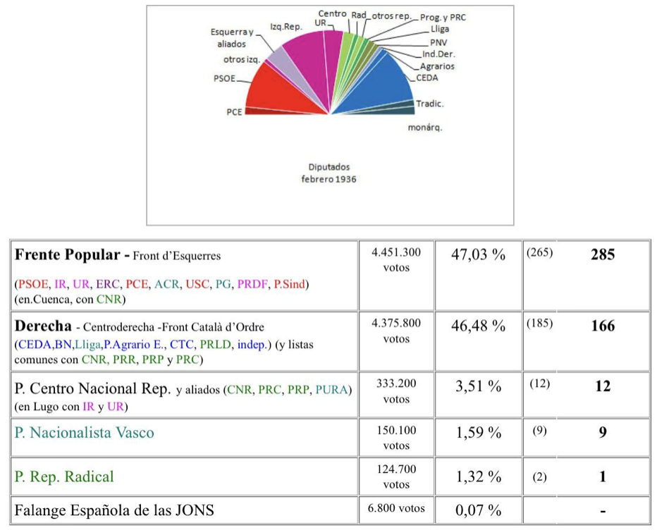 Us voldria demanar, abans que continueu amb la lectura de les línies que segueixen, que mediteu sobre la graella que acompanya aquest text. A partir del gràfic que es mostra i que representa el resultat de les eleccions del 19 de febrer del 1936, em mou la voluntat de compartir una visió particular (la meua) en el debat obert per Rufián. En primer lloc, no se’l pot acusar de ser un salt al buit, com veieu té precedents i, en segon lloc, els precedents exposats van ser bons per a l’esquerra –almenys fins que la violència de la dreta els destrossara.