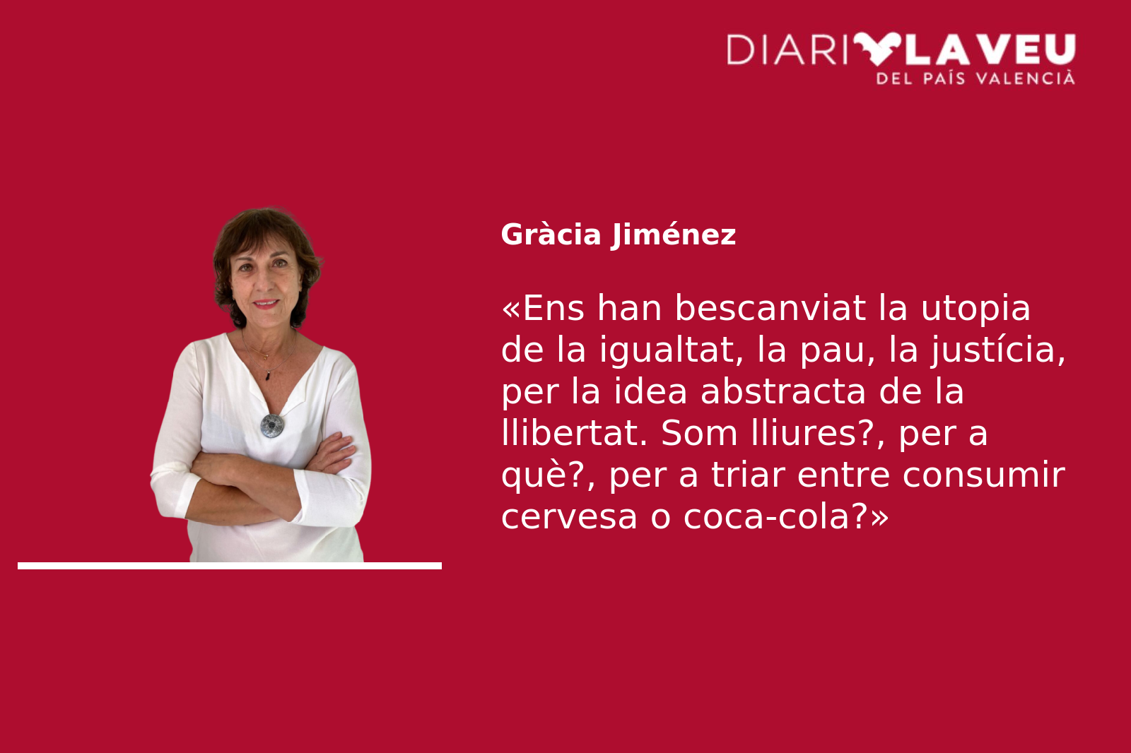 Escabussem-nos, en termes nàutics, en eixes escletxes: qui de nosaltres o els seus fills, pares i mares, amigues… no és víctima de treballs precaris i inestables, habitatges de preus impossibles, hipoteques i tipus d’interès altíssims, transports deficients i cars, cistelles de la compra estratosfèriques?… O qui no s’ha sentit allobit per parlar o escriure en valencià?… Continuem? No; no cal, veritat? De com està la carestia de la vida, tots entenem. Que l’1% de la població espanyola concentra més del 23% de la riquesa, és una dada incontestable, com ho és que any rere any el percentatge d’acumuladors augmenta -ho diuen les estadístiques-. El que no està tan clar és si som conscients de com uns pocs decideixen per nosaltres les coses que són importants per a nosaltres. I és que la majoria som gent normal, millor dit gent ordinària, que no entenem massa ni d’economia ni d’assumptes de la política, ni, ai!, tampoc conservem l’esperit lluitador d’anteriors generacions entre gent normal, corrent, o ordinària. Ens han bescanviat la utopia de la igualtat, la pau, la justícia, per la idea abstracta de la sacrosanta llibertat. Sí, som lliures! Som lliures?, per a què?, per a triar entre consumir cervesa o coca-cola?