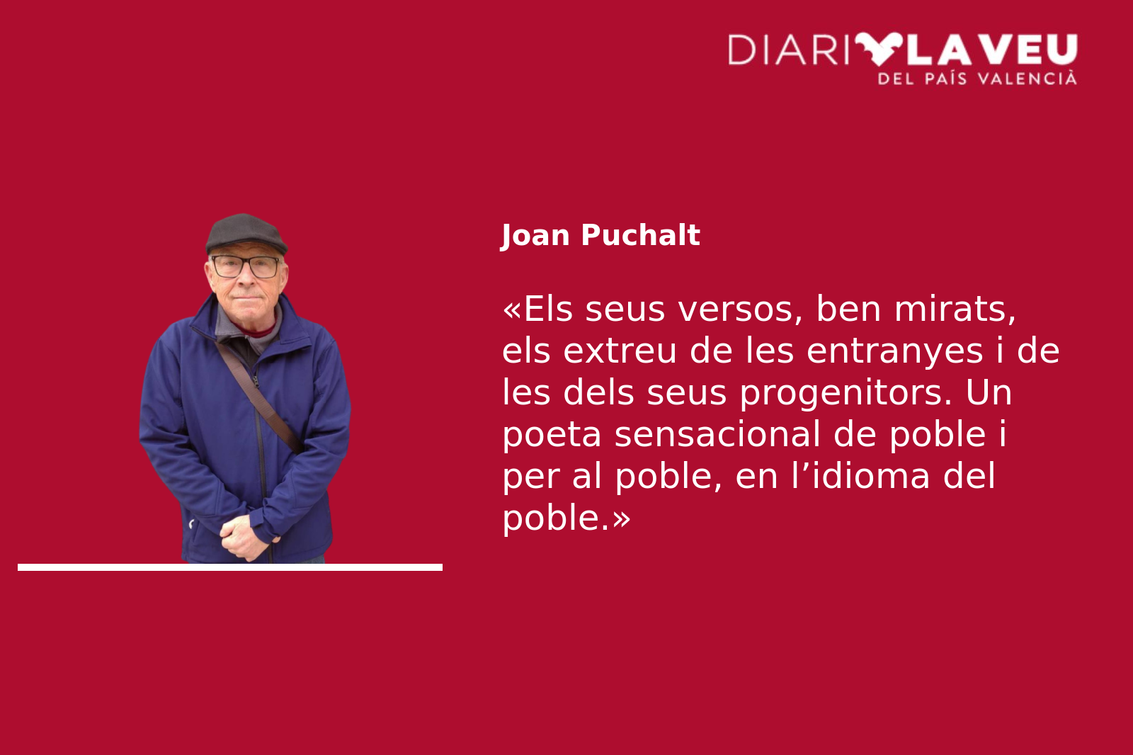 Si em preguntaren per què soc estellesià diria sense embussos: ho soc no ja perquè vull, que també, sinó perquè és el meu referent poètic. Els seus versos, ben mirats, els extreu de les entranyes i de les dels seus progenitors. Un poeta sensacional de poble i per al poble, en l’idioma del poble. Ple de sensacions com el desig, o la paradoxa, fets que de vegades semblen desconcertants, però farcits de sentit, de genialitat, d’una aclaridora contundència. Com a mostra, vos deixe el poema «Jo soc Ningú, i Ningú m’anomene»: