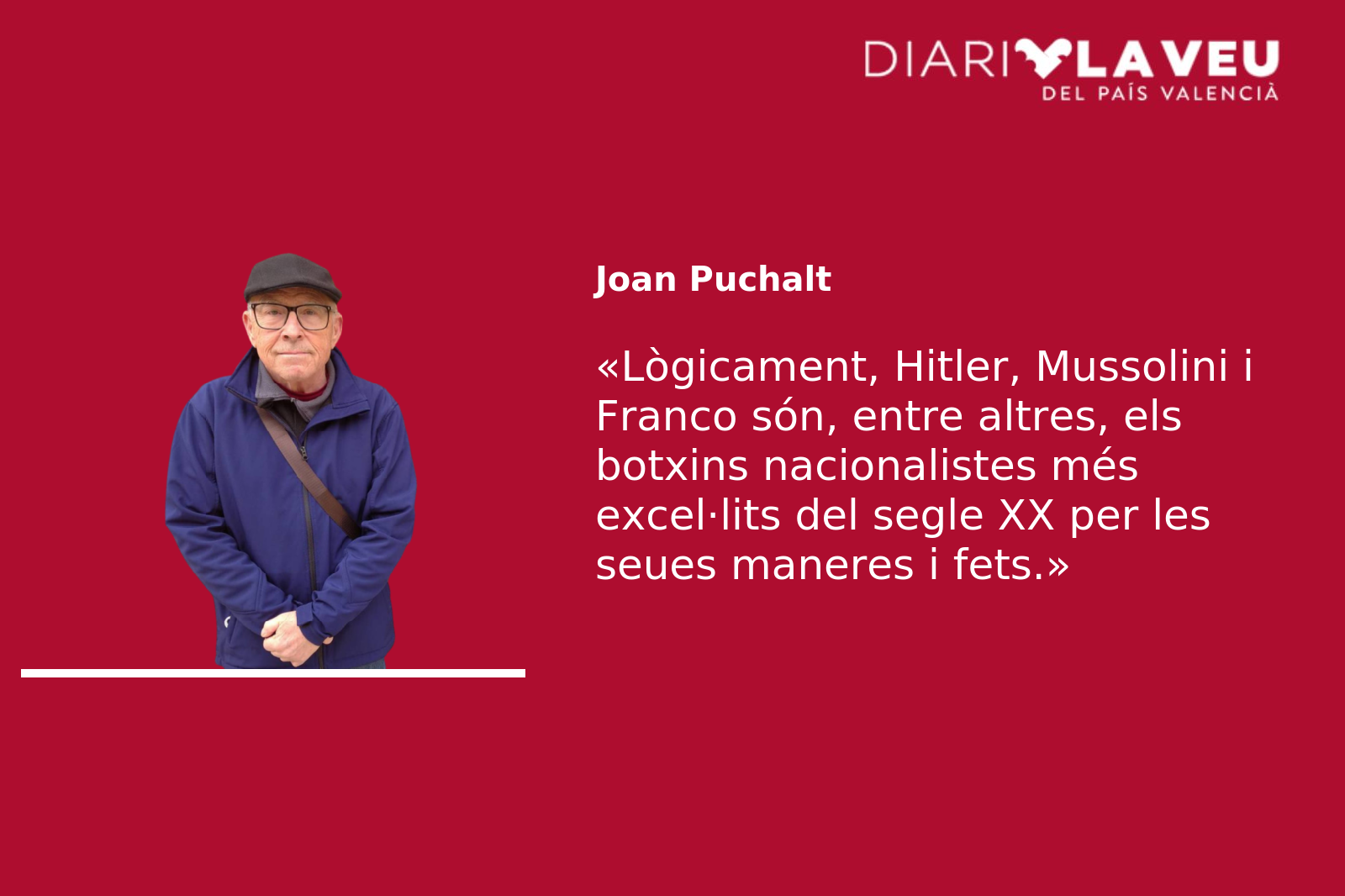 Lògicament, Hitler, Mussolini i Franco són, entre altres, els botxins nacionalistes més excel·lits del segle XX per les seues maneres i fets. Tots trets n’han fet de ben grosses a força d’aprofitar-se de febles i pobles i balafiar la seua ignorància per posar-los la por al seu si i a les butxaques, i endemés també deixar un reguitzell enorme de nacionalistes que combreguen i actuen com ells, amb l’ideari i fets ben procaços, els quals els trobem resant rosaris o amenaçant a qui no pense com ells.