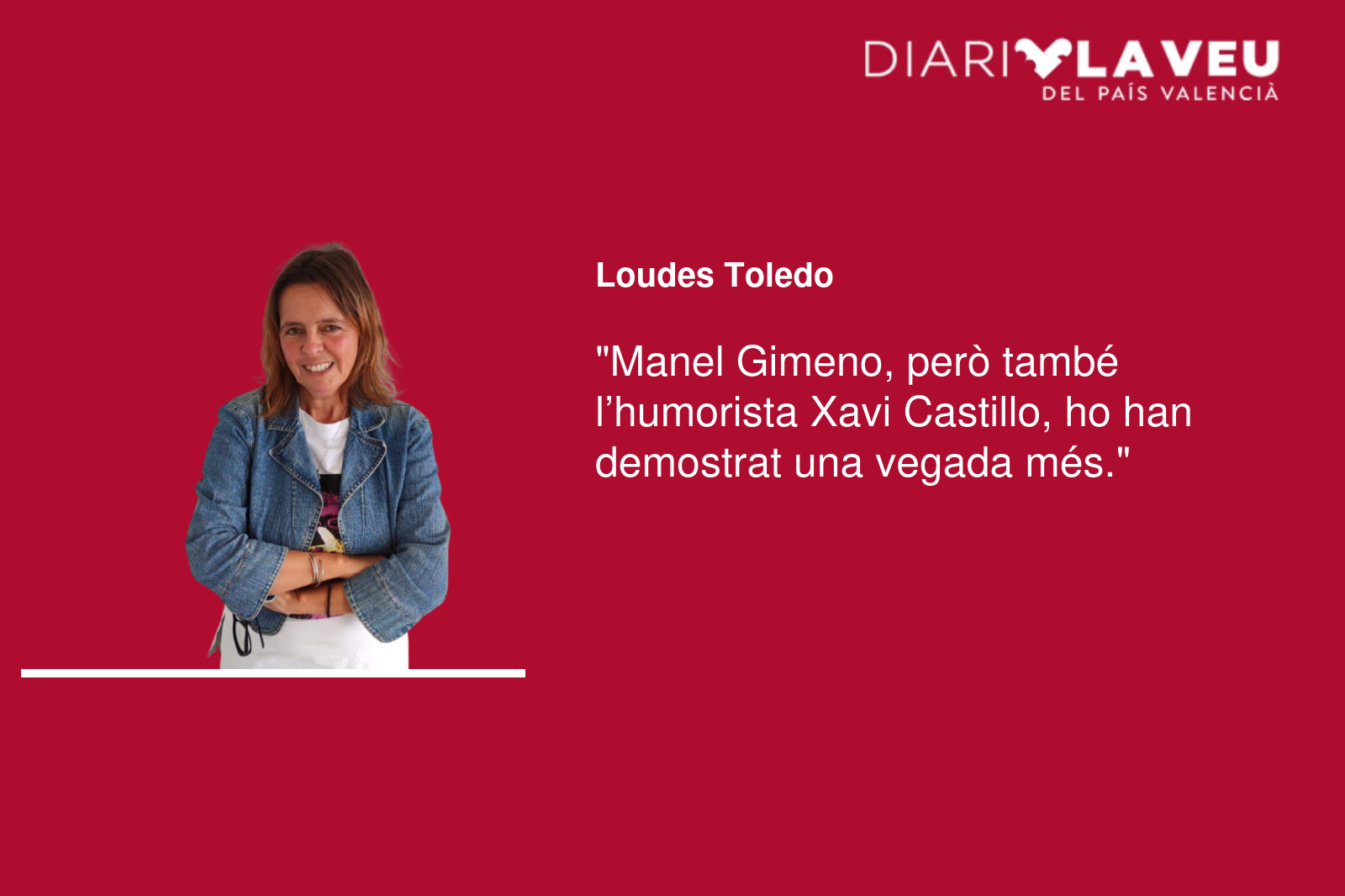 Els jocs de paraules, els referents socials i culturals, l’expressió gràfica caricaturitzada, la comicitat, la ironia i l’exageració són de vegades la manera més efectiva de reflectir la realitat i arribar als receptors, als lectors. Manel Gimeno —il·lustrador, guionista, grafista i editor— es mou des dels anys setanta a través d’aquests canals, tan propis de la historieta il·lustrada i l’humor gràfic, però també Castillo —qui va sofrir els danys materials de la gota freda en carn pròpia, quan tot just s’havia mudat a un local a pocs metres del barranc de Picanya— du l’humor i la crítica a l’escenari, capaç de posar veu i rostre a una galeria de personatges que ell interpreta en directe, només col·locant-se un jupetí, un collar de perles, un casc o qualsevol objecte simbòlic que l’espectador avesat copsa a primer colp d’ull.