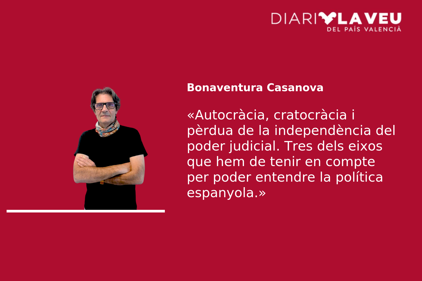 L’arquitectura d’un sistema democràtic on el poder es reparteix en tres àrees, amb funcions ben delimitades: el poder executiu, el legislatiu i el judicial. No és un capritx del destí. De tots tres, és el poder judicial el que garanteix que tot el sistema funcione d’acord amb el contracte inicial de constitució del país, per tant, ha de ser extremadament imparcial i independent del poder polític per a garantir que els drets dels individus, que recordem han cedit part de la seua llibertat, no siguen violentats per un poder, el polític, que es defineix com aquell que té el monopoli de la violència, i que l’exerceix per a mantenir la integritat del país i la seguretat del conjunt de la població (normalment, és així com ho reflecteixen les diferents constitucions dels països democràtics).