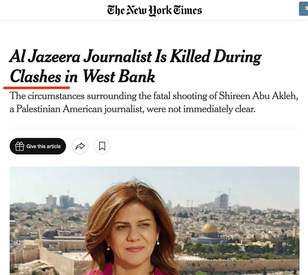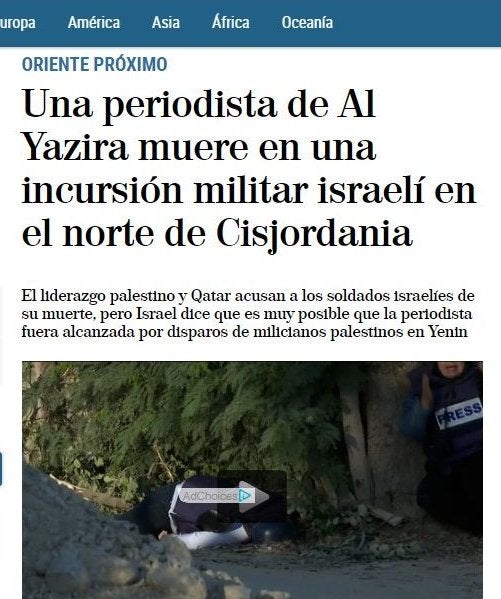 En els fets d’aquesta setmana, el titular ha estat: «Una periodista de Al Yazira muere en una incursión militar israelí en el norte de Cisjordania». Acompanyat d’aquesta explicació: «El liderazgo palestino y Qatar acusan a los soldados israelíes de su muerte, pero Israel dice que es muy posible que la periodista fuera alcanzada por disparos de milicianos palestinos en Yenin». Ara doncs, no només la periodista no ha estat assassinada, sinó que «ha mort», que s’és molt menys contundent a l’hora d’assenyalar culpables.
