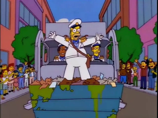 Matt Groening ja ho va preveure allà pel 1998 (una predicció de tantes) al capítol de The Simpsons que s’anomena Residus Titànics. A l’episodi, a conseqüència d’un cabreig de Homer amb els operaris de recollida, s’exploren distintes formes de recollida de residus fins que Homer arriba a ser el responsable de la recollida de Springfield. Ja es poden imaginar com va acabar aquell nou model absurd que va imposar l’edil de Springfield, on era l’empresa de recollida la que havia de fer tota la feina per recollir les bosses del fem fins a uns extrems còmics. Per cert, a l’episodi es pot veure com als EUA ja es fa la recollida porta a porta i alguna referència a la recollida de les cel·luloses higièniques.