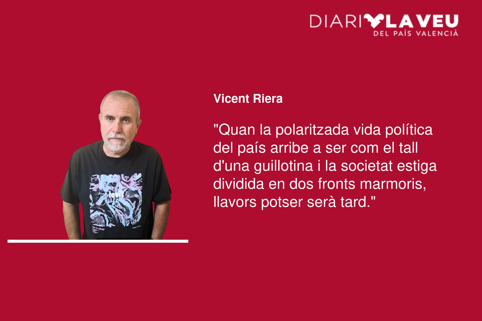 El meu amic Francesc, que és molt tranquil i assossegat, em sol dir, quan prenem café de bon matí, que el malestar actual només és present en l’escena política, en les xarxes digitals i en alguns mitjans de comunicació; que la gent normal i corrent fa el seu dia a dia com sempre, preocupada per la salut, els fills, els diners i les restants quotidianitats indefugibles. Però jo sempre li responc que existix el risc que eixe malestar present en l’esfera politicomediàtica, com ha passat altres vegades, acabe calant entre la població. Ja sabeu, les persones podem ser molt manipulables. La gent ara viu immersa en els seus quefers diaris i passant l’estona amb les seues ferramentes digitals, però la dogmàtica i mediocríssima classe política de què gaudim ja s’encarregarà de posar el dit en la llaga d’aquells assumptes molt qüestionables que susciten moltíssima divisió. Quan la polaritzada vida política del país arribe a ser com el tall d’una guillotina i la societat estiga dividida en dos fronts marmoris i ultradefinits, llavors potser serà tard i recaurem en els errors de sempre.