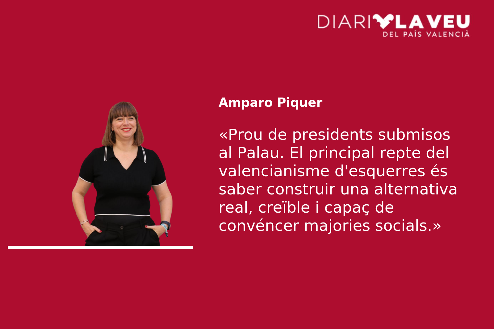 Prou de presidents submisos al Palau. El principal repte del valencianisme d’esquerres és saber construir una alternativa real, creïble i capaç de convéncer majories socials per a, d’una volta per totes, tindre un president o presidenta d’estricta obediència valenciana, que sàpiga representar-nos amb tota la dignitat que pertoca i que sempre que haja de triar entre el poble valencià i qualsevol altra cosa trie el poble valencià. És el mínim que es mereix este país: no tindre un ninot de president. Més que mai, és l’hora de treballar per a fer-ho possible.