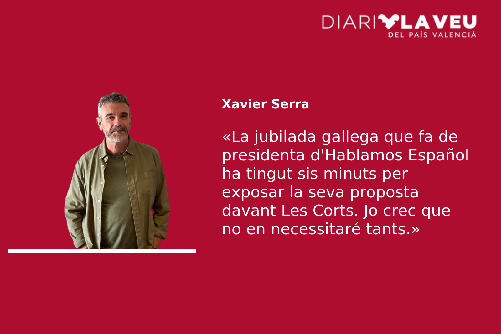No cal dir que els ramats de Vox que pasturen a Les Corts s’ho han agafat amb moltíssima il·lusió. Ja era hora que algú els endevinés els pensaments. La iniciativa, per arrodonir el cinisme, es diu: «Iniciativa legislativa popular sobre la llibertat d’elecció de llengua», que vol dir que ells tenen llibertat d’imposar-nos des d’un club falangista d’Ourense o des d’un tristíssim entresòl rellogat de Benidorm la llengua dels rètols, de l’escola i dels empleats públics. Els del Pp, però, no han volgut donar els seus vots als d’Hablamos Español. I no per falta de ganes, sinó perquè les iniciatives legislatives que preparen els fanàtics que dirigeixen la Conselleria d’Educació pensen que seran encara pitjors. En fi, gràcies a aquesta professora jubilada que ha vingut des de Vigo, o des de ves a saber on, per a salvar el bilingüisme al País Valencià, i gràcies a tota la claca que l’acompanyava, hem pogut constatar com és de perillosa la situació en què ens trobem.