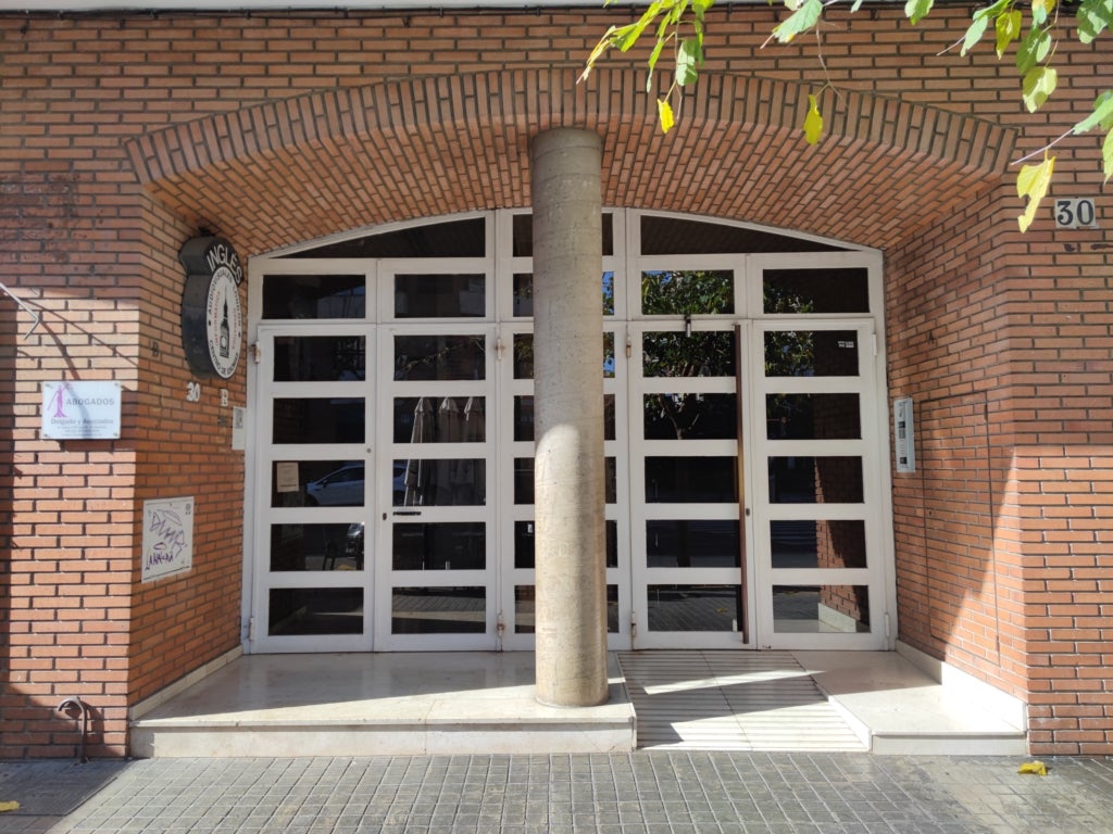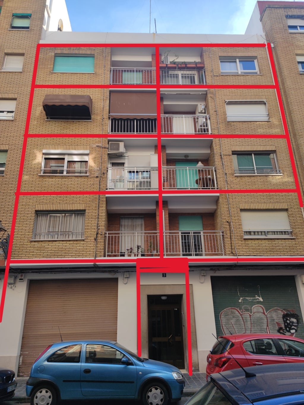 Aquest és un problema que exigeix una solució. En aquelles dècades, es va optar per recolzar en una biga el pilar central de les plantes altes, de manera que el pilar de planta baixa es divideix en dos i deixa pas a la porta. Com podeu imaginar, tots els pilars de les plantes altes descansen en una biga que, encara que curta, necessita un bon cantell (la dimensió vertical). No era una dificultat insalvable, fins i tot en una construcció amb un nivell de qualitat molt modest, com la majoria de les d’aquella època. En la següent fotografia d’un edifici de València —un entre tants— es comprendrà millor el problema i la solució. Hi he remarcat els pilars i les bigues amb línies de color roig: