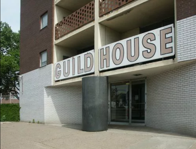 I és un pilar ben gros, molt més que el pilar estructural que probablement recobreix. La dimensió del pilar real, el que forma part de l’estructura de l’edifici, deu tenir una dimensió molt menor, la tercera part aproximadament. El de la Guild House és tan gros que sobresurt del pla de la façana. És veritat que, tot i situar-se davant mateix de la porta d’entrada, les fulles abatibles es dupliquen, a un costat i a l’altre. A més, aquestes portes estan retirades de manera que s’hi crea un espai previ. Tot això millora el resultat, com es veu en aquesta perspectiva: