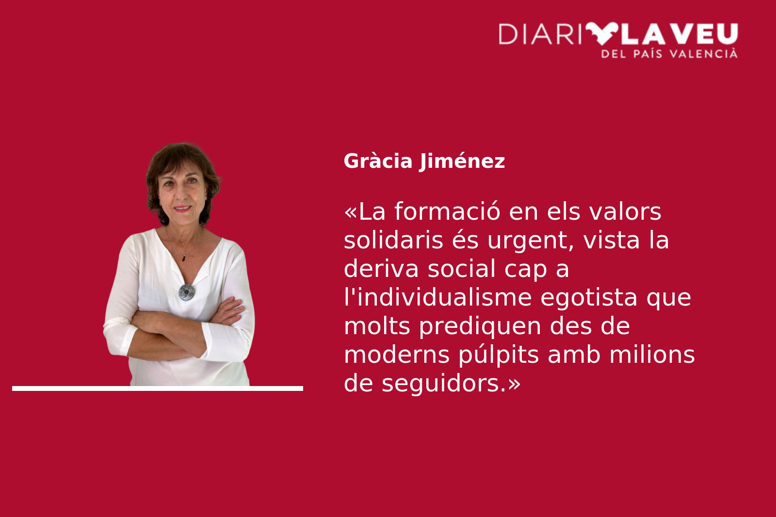 Però quin sentit tindria l’arreplega de coneixements importants si no reverteixen en una societat amb vocació de bondat i, per tant, de justícia? I com pot haver justícia sense igualtat? La formació en els valors solidaris és urgent, i més urgent encara, vista la deriva social cap a l’individualisme egotista que molts prediquen des de moderns púlpits amb milions de seguidors.
