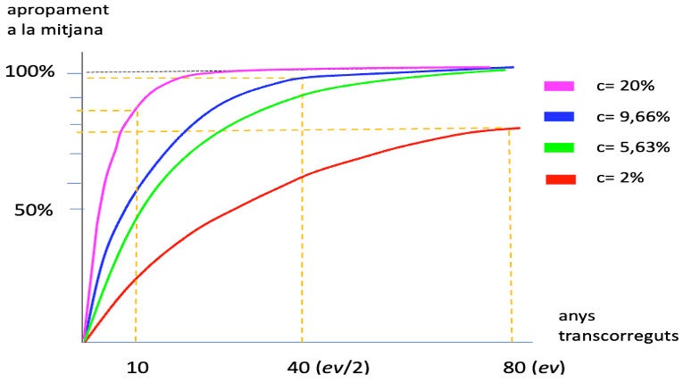 Per ajudar a comprendre millor el que estem enraonant he afegit les corbes vermella i rosa. La vermella, c= 2%, mostra que en 80 anys no s’arriba al 80% de la mitjana, és a dir, que a taxes d’increment c baixes ni tan sols qui completa l’esperança de vida arriba a una coproducció plena representada per apropar-se moltíssim a la mitjana. Per això considera Laborde c= 5,63% un valor mínim. Tanmateix, valors massa grans de c beneficia massa els joves. La corba rosa c= 20%, mostra que amb 10 anys un nen ja ha coproduït més del 80% de la mitjana.