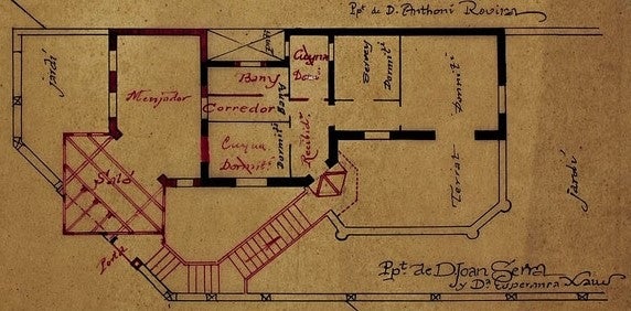 L’esquema de la torre Serra Xaus no és tan simple. Tampoc no és simètric, encara que hem de tenir en compte que el solar fa cantonada, a diferència del de la Malva-rosa. Deixant a banda totes les diferències, fixem-nos ara en el mirador que Jujol també fa protagonista de la composició. Com el de Ribes, és un mirador en el primer pis, que fa de porxe en l’accés principal. També té planta quadrada, obert en tres dels costats. Fins i tot hi trobem finestrals tripartits molt semblants.