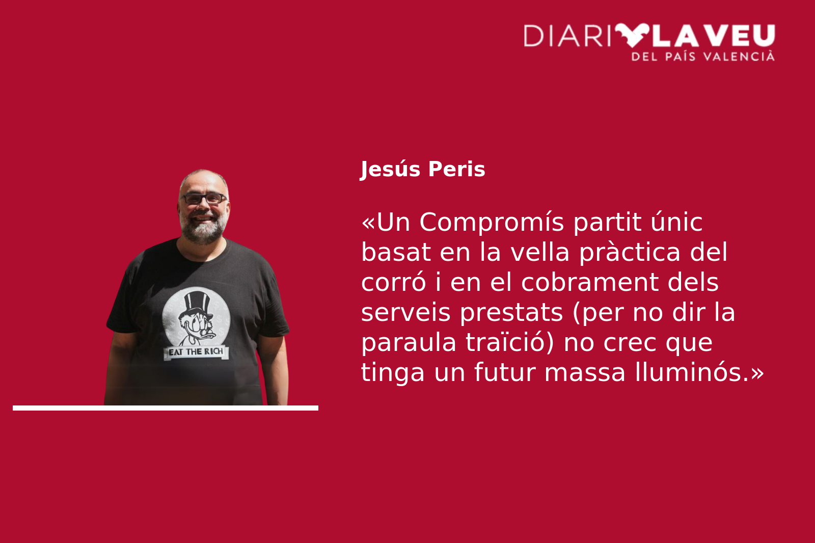 Personalment, estic a Compromís perquè estic a Iniciativa i, si en algun moment Iniciativa no existeix, me n’aniré a ma casa i continuaré escrivint aquestes columnes amb la mateixa independència. Són els avantatges de no estar per fer carrera política. Pense, per tant, que la federació de partits és la millor fórmula per continuar fent camí junts, i que la fortalesa de cadascuna de les parts complementàries és la fortalesa del conjunt. Però en qualsevol cas tinc molt clar que un Compromís partit únic basat en la vella pràctica del corró i en el cobrament dels serveis prestats (per no dir la paraula traïció) no crec que tinga un futur massa lluminós. Serà un altre pas -i ja en van uns quants- cap a la irrellevància política.