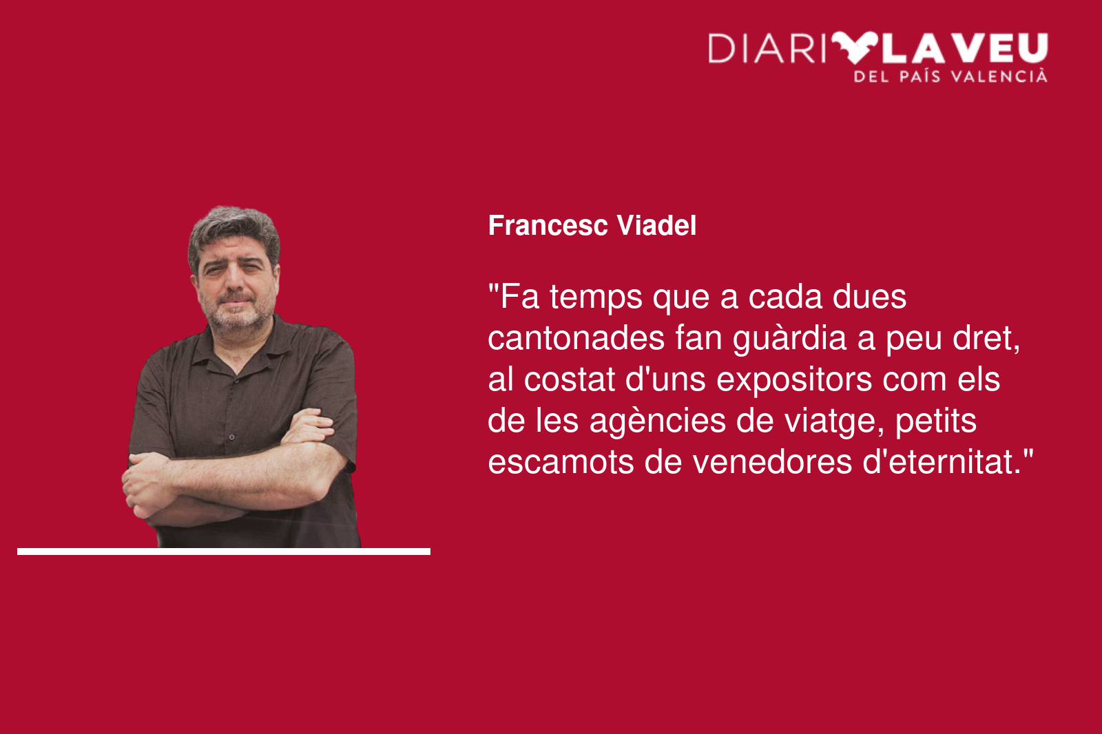 Aquests dies hi pense molt amb això de l’eternitat. Caic en el compte que fa temps que a cada dues cantonades, en molts accessos d’algunes de les estacions del metro, fan guàrdia a peu dret, al costat d’uns expositors com els de les agències de viatge, petits escamots de venedores d’eternitat. Solen ser joves i boniques. Quasi sempre les acompanya un home amb traça de comercial d’articles de ferreteria. Somriuen. Diríem que pràcticament es limiten a somriure com si amb això hi haguera prou per a entrar de cap en el seu món i deixar-se amanyagar per la veu melodiosa dels missatgers invisibles que asseguren que els escorten, que els alleugen de tantes pors ara que la fi del món la tenim a tocar.