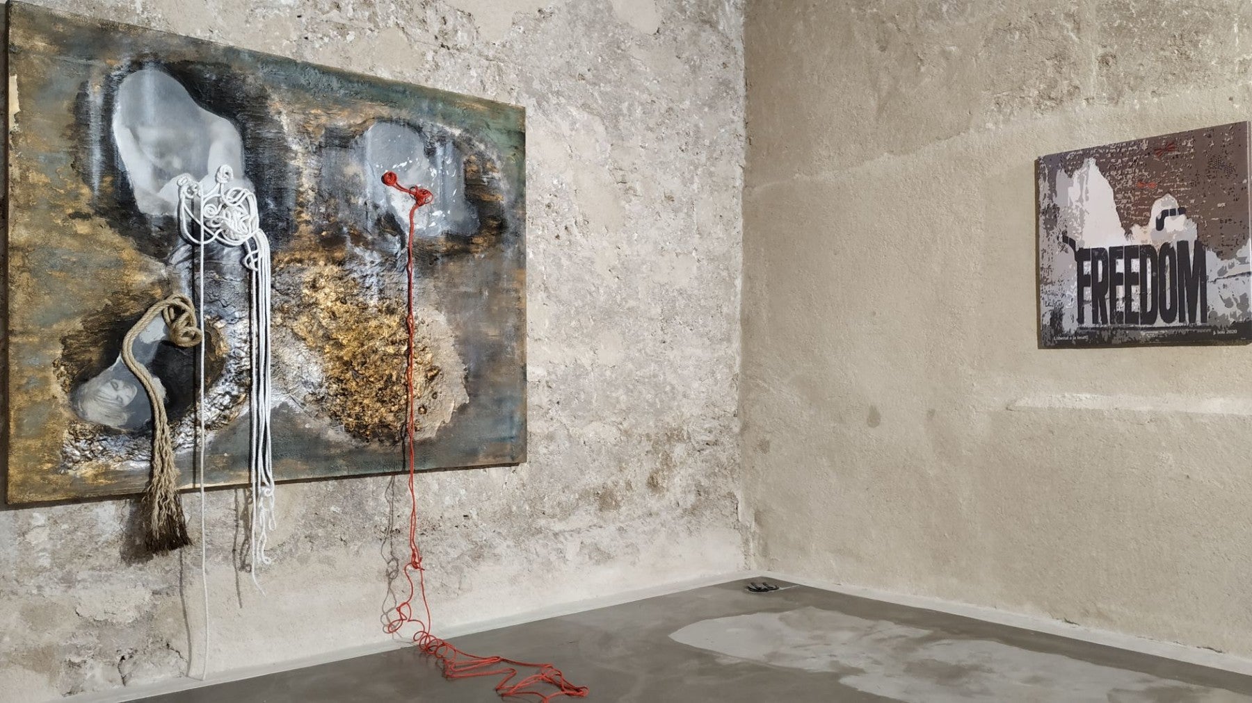 Ovidi Montllor, que deixà Alcoi i marxà a Barcelona a buscar-se la vida, com diria Jordi Tormo «com un obrer de la paraula», no ho va tindre gens fàcil. Molta gent el va ajudar, és veritat, però va haver de treballar de valent i en molts oficis diferents. Com diu Núria Cadenes en la biografia «L’Ovidi» (Editorial 3i4, 2002), «una vintena llarga d’oficis, potser, si es compten els que van obtenir una dedicació prou seriosa». Precisament el quadre d’Enric Piera, «Ovidi immigrant», un oli, terres i fusta, ens recorda aquell Ovidi que lluny de casa enyorava Alcoi i la seua família: «Estimada Antònia:/T’escric des d’ací./Molt lluny de casa./La pluja va mullant/els vidres bruts/del bar estrany/on ara em trobe esperant/ un got de vi/i un poc d’engany». Carta a casa). Així doncs, els primers passos en el món de la cançó van estar marcats, com hem vist, pels records de la seua ciutat, però també per la lluita i la ràbia acumulada contra una dictadura que perseguia, censurava i empresonava gent de tota mena. Alguns artistes d’aquesta exposició han escollit aquest moment per centrar la seua obra. Per una banda Xavier Vaquer, amb dos dels seues elements més característic, la tela i la fusta pintada, ens ha fet un collage, un «Homenatge a Teresa» («Amb una floreta al cap/ i un mocador negre al coll/ i faldes llargues/ i un cigarret». Homenatge a Teresa). Pep Sou, amb la poesia visual «Món i lluna de Teresa», també ha volgut homenatjar a aquesta alcoiana, la Teresa que acompanyà l’Ovidi tota la vida i la féu popular i universal. Però Sou també ha volgut regalar-nos una altra de les seues composicions, «Llibertat a la fera!», un digital sobre llenç on ressalta la paraula FREEDOM («Com són molts i ella és sola,/ no pot, i me l’estoven,/ i emprenyats per la feina/ a la gàbia me la tornen». La fera ferotge). I és que aquesta és una de les etapes més reivindicatives del cantautor alcoià. Una etapa on escriu, com dirà Joan Fuster, «una sèrie de peces molt ben parides[..] i van del sarcasme més virulent al patetisme més ingenu, i passen pel míting, per la poesia lírica pròpia, per l’exhumació de versos insignes». És l’Ovidi Montllor més rebel, l«Ovidi 1 i 2» del pintor Sento Masià, on s’hi poden veure dues cares del cantautorposant el crit al cel,amb totes les seues forces,denunciant injustícies («Visca la revolució! No us penseu que vol dir guerres,/ni destrosses, ni rancors./ Vol dir coses estimades: llibertat, justícia i raó»). És l’Ovidi més anarquista, com el collage «Sobre negre» que ens ha pintat Fuencisla Francés(«El color negre/que tant m’estime,/se’n vindrà amb mi./Jo sol de negre!»); és l’Ovidi clar i contundent de «Ja no ens alimenten molles» de Pau Sellés («Ja no ens alimenten molles./Ja volem el pa sencer./Vostra raó es va desfent./La nostra és força creixent». Tot explota pel cap o per la pota). El més reivindicatiu i idealista, l’Ovidi que s’identifica i dóna suport als moviments d’alliberament nacional, a les lluites obreres, vagues i manifestacions…L’Ovidi que ens esperona a llevar-nos la bena dels ulls i mirar més enllà, perquè com diria Jordi Gil «sota l’asfalt està la platja, sirena de la llibertat». Deia Gabriel García Márquez que «encara no és massa tard per a construir una utopia que ens permeta compartir la terra». Efectivament, aquesta és la idea d’utopia que menà a Ovidi Montllor («Tot era meravella. Perquè vull, Perquè estic fart de fàstics./Tot era de tothom. Perquè vull. Perquè tot és de tots». Perquè vull). En una entrevista que li va fer Montserrat Roig, 04-02-1942, deia: «Per a mi, l’ideal de societat futura és una utopia. Seria que totes les persones tingueren la possibilitat d’elegir el que elles volgueren». Però Ovidi sabia que el camí per cercar Ítaca està ple de viaranys, revolts i costeres, «si véns amb mi,/ no demanis un camí planer» diria Lluís Llach. El viatge és perillós, llarg, intens, dubtós i no tots s’arrisquen. Aquest és el tema dels dos quadres de Lluïsa Fuster. El primer, un grafit i collage, porta com a títol «El boig». És un boig aquell idealista i utòpic que s’arrisca a transitar per camis dubtosos per la mar? Ovidi ens diria: «Boig és el que calla,/o a l’ull té palla». Gola seca). I en el segon quadre Lluïsa ens dóna a entendre que en tots els viatges cal tindre constància, però també paciència o dit d’una altra manera «Endurança», el títol del segon quadre, un acrílic, grafit i tinta.