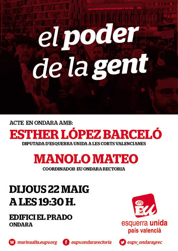 Serà el proper dijous 22 de maig a l’edifici “El Prado” d’Ondara, amb Esther López Barceló (Diputada d’EUPV a les Corts Valencianes) i Manolo Mateo (Coordinador local d’EUPV).