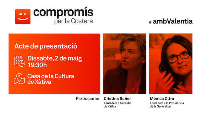 El pròxim dissabte 2 de maig a les 19.30 de la vesprada, a la sala noble de la Casa de Cultura de Xàtiva, tindrà lloc l’acte central de COMPROMÍS la Costera, amb els parlaments de Cristina Suñer i Mònica Oltra i la presència dels candidats a l’alcaldia dels pobles de la comarca.