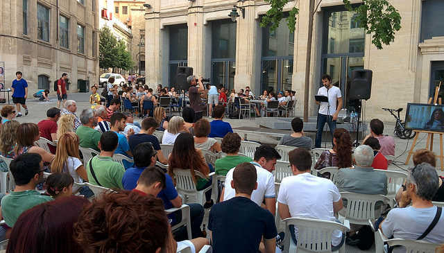 Abans de l’actuació, Cristian Santiago, número dos de la candidatura de Guanyar Alcoi, va fer una petita intervenció explicant què i qui som Guanyar Alcoi, l’Alcoi que volem i animant a la gent perquè el 24 acudisca a votar.