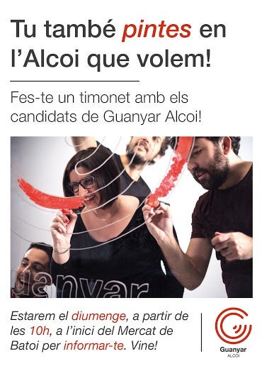 El diumenge dia 10, a partir de les 10 hores, els candidats i candidates de Guanyar Alcoi i tota la gent que ens vulga acompanyar, estarem a l’inici del Mercat de Batoi.