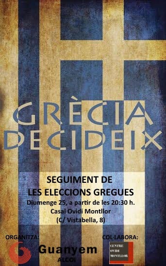 Hem organitzat al Casal Ovidi Montllor, a partir de les 20:30 h, una vesprada diferent on es podrà seguir per projector els resultats de les eleccions gregues i ens podrem fer una cervesa o un refresc mentre comentem i analitzem una mica els resultats d’unes eleccions que considerem que poden suposar l’inici d’una revolució democràtica i social a Europa.
