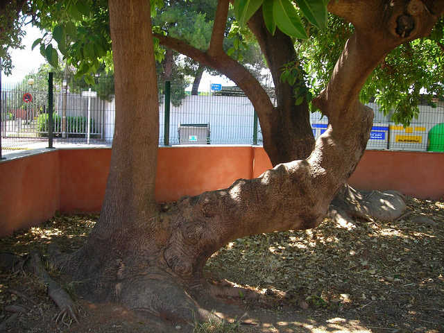 Aquests exemplars d’ombú o bellaombra són arbres d’aigua, previnent d’Amèrica, i que creixen molt. Servien per fer ombra al pati de l’Escoleta i els troncs i branquen eren jocs per als més menuts.