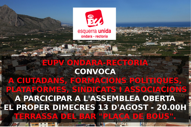 Esquerra Unida d’Ondara, ha convocat una assemblea ciutadana oberta per al proper dimecres 13 d’agost a les 20.00h. a la terrassa del bar de la Plaça de Bous, amb la intenció que se sumen qualsevol persona que vulga canviar la situació actual d’Ondara, vinguen d’alguna altra formació política, plataforma, sindicat o associació.
