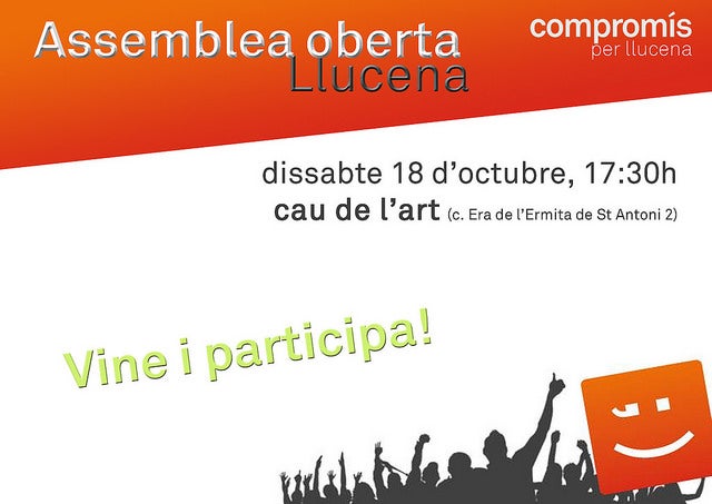 Compromís ha organitzat, al municipi de Llucena, una assemblea oberta a la ciutadania per tal d’aportar idees sobre el municipi i plantejar possibilitats de futur. L’assemblea tindrà lloc aquest dissabte 18 d’octubre, al Cau de l’Art, a les 17.30 hores, i estarà oberta a la ciutadania.