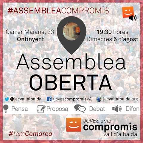 Este dimecres 6 d’agost tindrà lloc una Assemblea Oberta dels Joves amb Compromís de la Vall d’Albaida. En el nostre afany per obrir la participació política a tota persona que així ho desitge i compartisca els valors de Compromís, la nostra organització segueix actuant de baix cap a dalt, recollint propostes des de la base per tal d’actuar allà on estem representats. La política ha d’estar al servei del poble, i per tant la ciutadania ha de participar de les decisions que els representants prenguen.