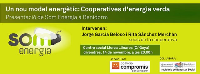 Després de la presentació de l’Economia del Bé Comú el passat mes d’abril i de la conferència sobre Banca Ètica de fa unes setmanes, Compromís per Benidorm continua apostant per donar a conéixer a la ciutadania diferents alternatives econòmiques o amb repercussió per a les nostres butxaques. En aquest cas, el pròxim 14 de novembre a les 20 hores el Centre Social José Llorca Llinares (c/Goya) de Benidorm acollirà la presentació de la cooperativa energètica Som Energia.