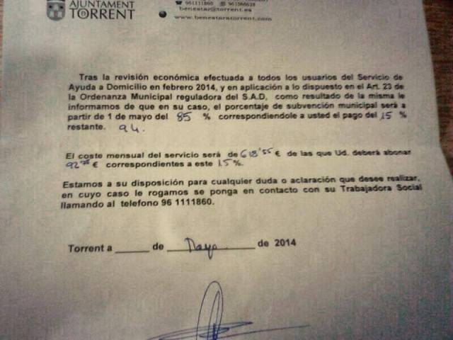 Aquest setmana ha arribat una carta de l’Ajuntament de Torrent a un veí dependent informant que l’assistència a domicili ha sofrit un canvi. Eixe canvi no és altre que la persona afectada que rep aquesta ajuda haurà de pagar un 15% del cost d’aquest servei, és a dir uns 100 euros. El veí de Torrent té una pensió per discapacitat de 340 a la qual se li ha de restar el cost d’aquest servei.