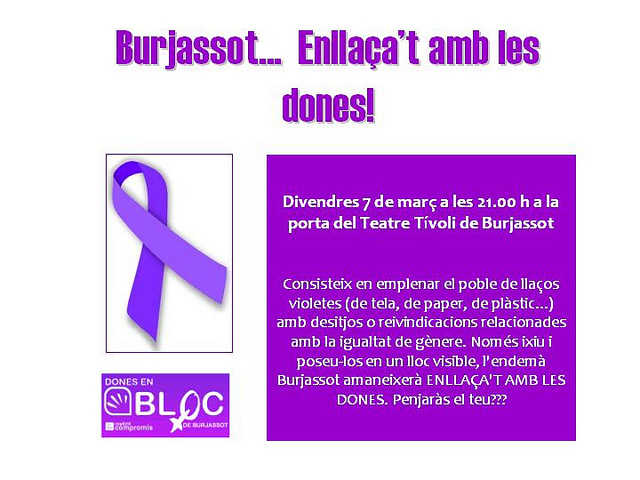 La trobada es farà a les 21:00 al Teatre Tíboli de Burjassot.El Col·lectiu Dones en Bloc està composat per dones del Grup Bloc-Compromís de Burjassot, l’objectiu del qual és vetllar per la igualtat de gènere entre homes i dones, ajudar a la dona a què accedeixa al mercat laboral, lluitar contra la violència de gènere, i fer seues totes aquelles reivindicacions que tinguen com objectiu protegir la dona en aquesta societat –encara- patriarcal.