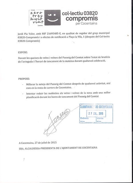 “Un dels motius que ens mou a demanar açò és fer d’altaveu real de les protestes i propostes de les persones. El poble està brut i no és gens higiènic. A més a més, no causa una bona imatge de la Cocentaina que volem projectar turísticament al món” –ha explicat Pla– “Cal sanejar els entorns dels contenidors i cal que és netegen amb major freqüència les rajoles del terra amb aigua a pressió com es fa en altres pobles de la comarca.