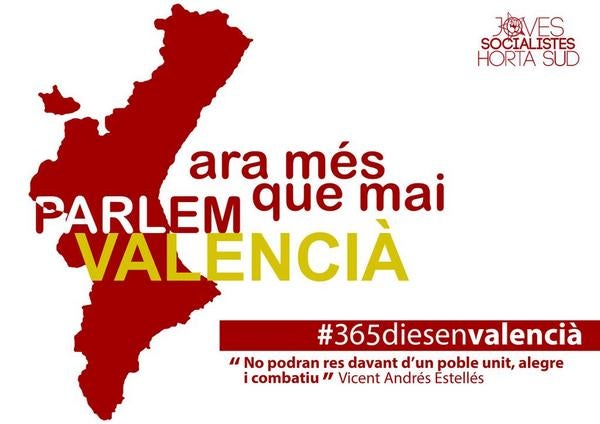 Joves Socialistes de l’Horta Sud llancem la campanya #365diesenVALENCIÀ per promoure l’ús del valencià. Són temps díficils per a la nostra llengua ja que el Partit Popular ha disminuit notablement les línies en valencià a la educació pública reduint l’ús del valencià a les nostres escoles.