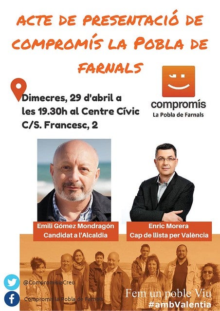 El proper dimecres 29 d’abril, el col·lectiu Compromís per la Pobla de Farnals farà la presentació de la candidatura a les eleccions municipals que lideren Emili Gómez Mondragón, Ana Borja Royo i Ferran Ortolà. En l’acte de presentació participarà Enric Morera, actual síndic del grup parlamentari de Compromís a les Corts Valencianes i cap de la llista per València de la coalició. L’acte començarà a les 19.30 de la vesprada al Centre Cívic de la Pobla de Farnals (carrer de Sant Francesc, 2).