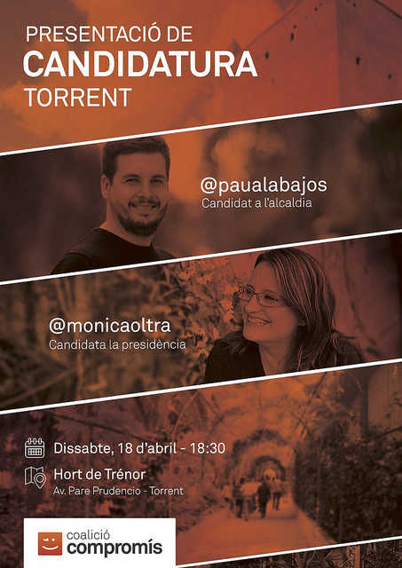 Compromís per Torrent presentarà aquest dissabte 18 d’abril, a les 19h i en l’Hort de Trenor, la seua candidatura per a les properes eleccions locals que tindran lloc el 24 de maig. L’acte comptarà amb la participació de la candidata a la Presidència de la Generalitat per part de Compromís, Mònica Oltra.