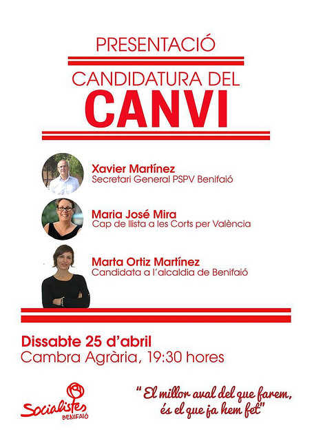 Volem fer extensiva i de forma pública la invitació al referit a tots els veïns i veïnes al nostre event perquè ens acompanyen el proper dissabte 25 d’ abril a les 19:30 a la Cambra Agrària de Benifaió perquè puguen conèixer de primera mà, la què vol ser la CANDIDATURA DEL CANVI QUE BENIFAIÓ NECESSITA.