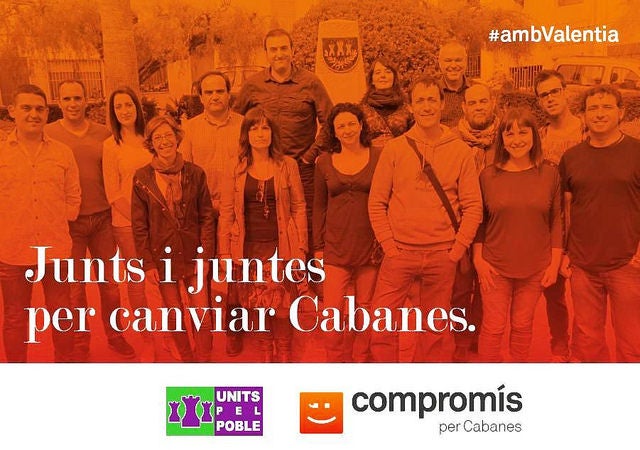 Un total de 18 persones de tot el terme municipal ( Cabanes, La Ribera, Torre la Sal, Borseral, i zones disseminades), amb ganes, energia i valentia per intentar canviar a millor el futur de tot el poble. Des d’Units pel Poble-Compromís s’aspira a aconseguir la confiança de la majoria dels veïns i veïnes per obrir una nova etapa a l’ajuntament de transparència, honestedat, participació, diàleg, consens, i entusiasme per millorar el poble.