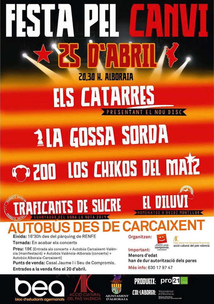 El concert del 25 d’Abril denominat Festa pel Canvi, organitzat per Acció Cultural del País València i el Bloc d’Estudiants Agermanats, compta amb la col·laboració de l’Ajuntament d’Alboraia i la Universitat de València. Començarà a les 21.00 h al recinte del c/ Fusters d’Alboraia.