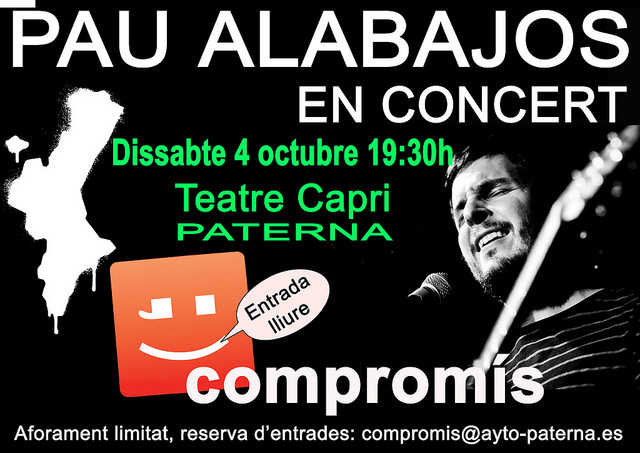 El portaveu municipal de Compromís en Paterna, Juanma Ramón, afirma que “deixar la celebració del 9 d’octubre limitada als actes institucionals ens sembla desaprofitar possibilitats per a commemorar un dia que és molt significatiu per als valencians i valencianes. Per això, des de Compromís per Paterna hem decidit celebrar-ho també amb un concert de Pau Alabajos el pròxim dissabte 4 d’octubre, a les 19.30 hores, en el Teatre Capri del poble amb entrada lliure”.
