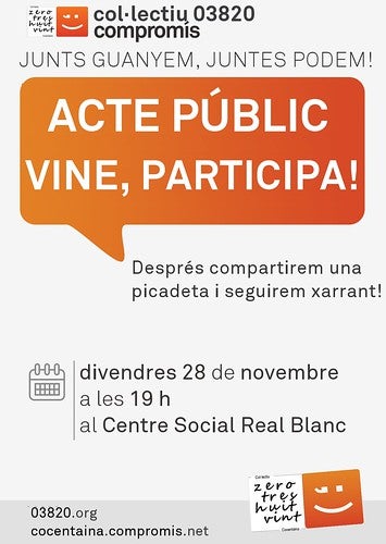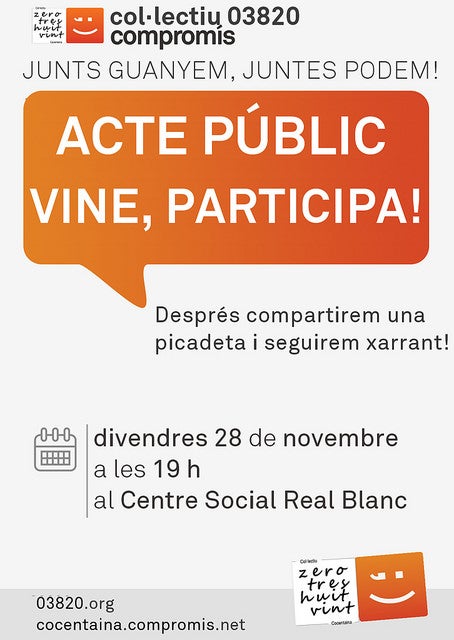 Els interessos de les persones i de Cocentaina estan per davant de tot. Per això, el Col·lectiu 03820 i Compromís han impulsat la constitució d’una coalició local per presentar una candidatura conjunta a les eleccions municipals de 2015. Un vertader moviment ciutadà obert de caràcter assembleari amb la intenció de sumar entitats, organitzacions polítiques i persones de Cocentaina per a treballar conjuntament per tal de millorar el nostre poble i la vida de la nostra gent. Amb la teua participació i el teu suport canviarà la forma de governar. Ho podem fer possible sempre que t’impliques en un projecte per a construir entre totes i tots la Cocentaina del demà.