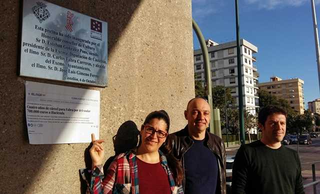 Compromís ha demanat a la Diputació Provincial que retire totes les plaques en les que figuren noms dels polítics condemnats en ferm per corrupció, com la que encara es pot trobar a l’entrada de la piscina provincial de Castelló. Amb la intenció de denunciar aquesta situació, el diputat provincial Xavier Trenco, la diputada autonòmica Belén Bachero i el secretari local de Compromís, Ignasi Garcia, s’han fotografiat davant de la placa on apareix el nom de l’ex president de la Diputació, Carlos Fabra, condemnat a quatre anys de presó per defraudar Hisenda. Trenco ha recordat que Compromís ja ha demanat en anteriors ocasions la retirada d’aquest tipus de reconeixements, una iniciativa que sí que ha tingut resposta en alguns municipis com el d’Alcalà de Xivert on, a proposta de la coalició, el ple va acordar eliminar les plaques. “El president Moliner hauria de prendre exemple, sobretot si recordem que l’any 2014 ja va anunciar, de forma contundent i en compliment de la Llei de Transparència, que anava a retirar les plaques on aparegués el nom del seu antecessor”, ha destacat Trenco . “Però encara no ha tingut temps”, ha ironitzat el portaveu de Compromís a la Diputació.