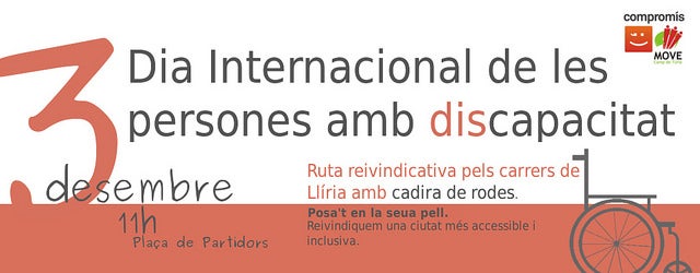 Amb motiu del Dia Internacional de les persones amb discapacitat, des del col·lectiu de Compromís-Move han organitzat un ruta reivindicativa pels carrers de Llíria amb cadira de rodes. Aquesta ruta tindrà lloc a la Plaça de Partidors a les 11h del matí.